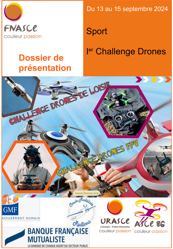 L’ASCE 86 sera heureuse de vous accueillir pour disputer le 1er challenge national de "Autour des drones" du vendredi 13 au dimanche 15 septembre à Rouillé (86).