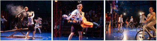 Du haut de leur vélo, ivres de notes de musique et d’acrobaties, les onze interprètes musiciens, circassiens et danseurs de la fanfare cirque Circa Tsuïca du Cheptel Aleïkoum questionnent le vivre ensemble. Des histoires mises en scène dans une scénographie où les repères de pistes et de gradins s’estompent. Le chapiteau devient un quartier, une place du village, ou une rue d’où naissent des rencontres fugaces au beau milieu d’un tohu-bohu de bicyclettes.
