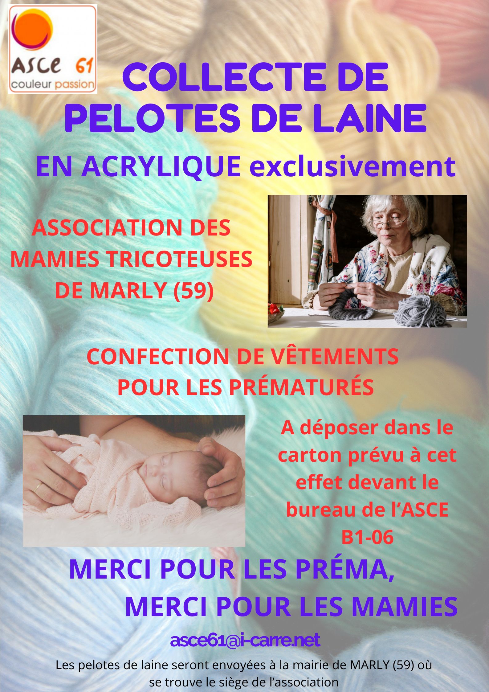 L’association des mamies tricoteuses de Marly (59) confectionnent des vêtements en laine acrylique (exclusivement) pour les prématurés.