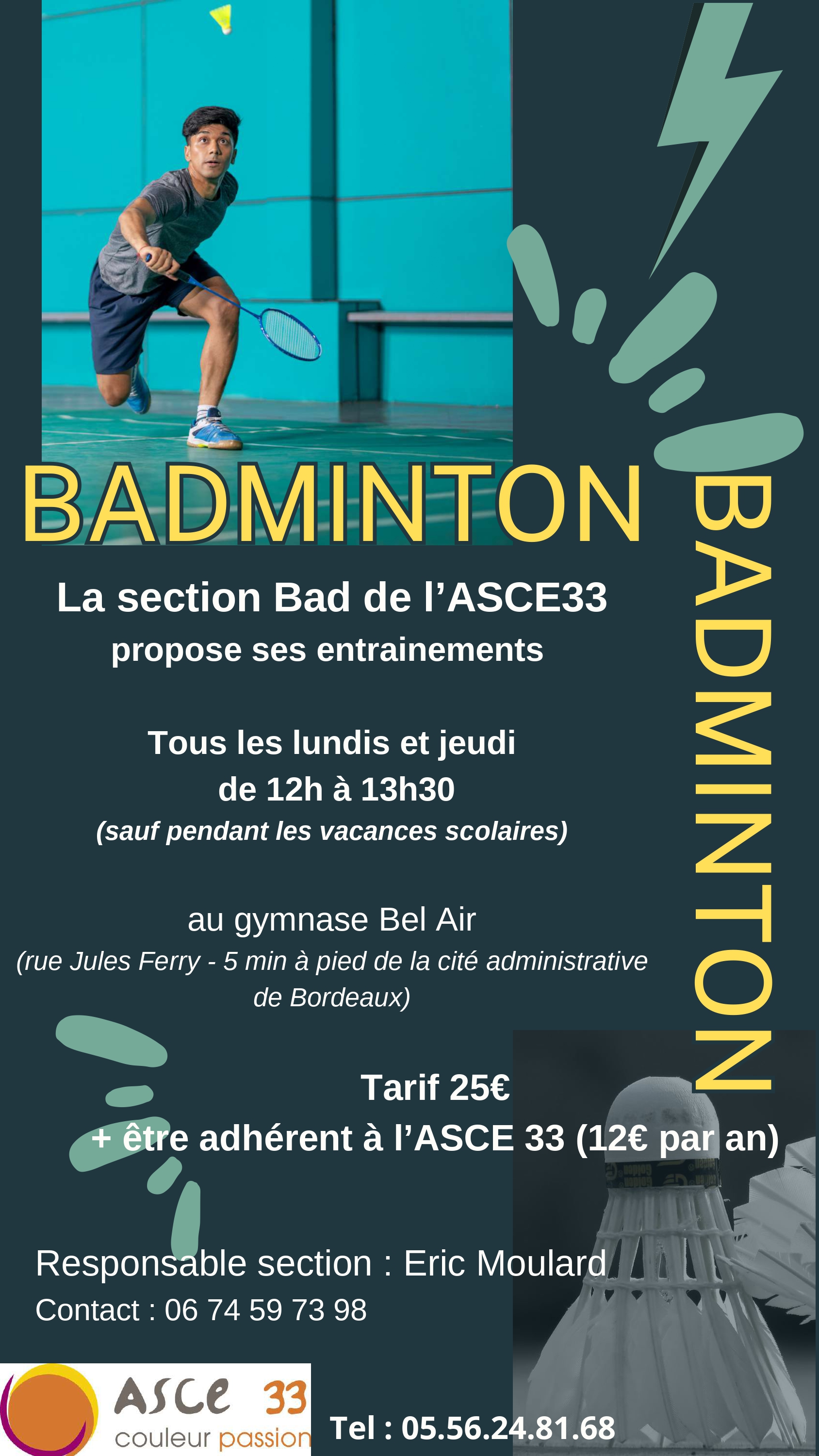 Le bureau de la section badminton de l’ASCE 33 a le plaisir de vous convier à une soirée sportive au club Squash et Bad, 215 avenue Pasteur à Pessac, le vendredi 24 avril 2026 à partir de 18h30, avec la participation du CEREMA.