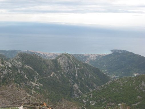 Nous reste encore le ressaut final, de plus en plus abrupt, mais on arrive enfin au sommet, qui nous réserve la belle surprise d’une vue magnifique sur la baie de Menton jusqu’au cap d’Antibes et, évidemment, toutes les montagnes du Mercantour que nous connaissons bien.