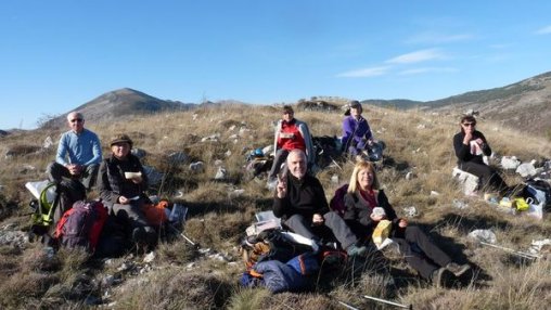 L’heure tourne, le soleil se couche tôt à cette époque : nous décidons de ne pas continuer jusqu’à Bézaudun qui était notre objectif initial. Nous préférons grimper en haut d’un petit tertre dénommé le Puy pour y déjeuner au soleil, face à un panorama bien dégagé sur la chaîne du Mercantour. Les sommets sont peu enneigés pour la saison.