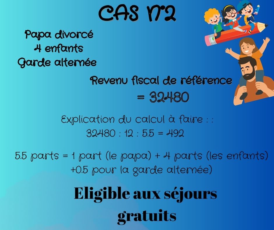 Le revenu fiscal de référence de l’avis d’imposition est le montant de base à prendre en compte pour le calcul des revenus mensuels de référence pour les séjours gratuits, il faut ensuite le diviser par 12 (mois), et diviser par le nombre de parts.