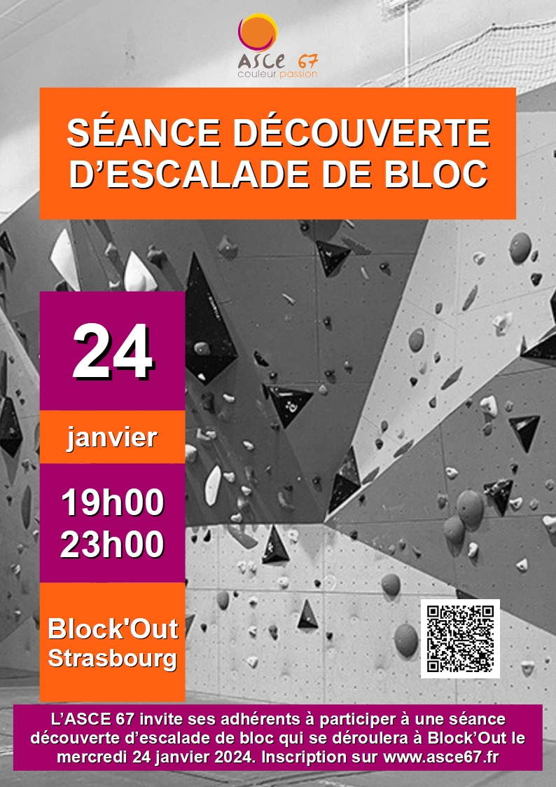 L’ASCE 67 invite ses adhérents à participer à une séance découverte d’escalade de bloc qui se déroulera à Block’Out le mercredi 24 janvier 2024.