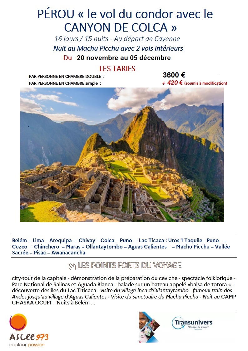 PEROU : le vol du CONDOR avec le CANYON de COLCA du 20 novembre au 05 décembre 2026