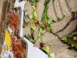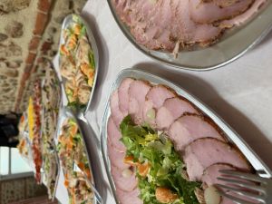 Le déjeuner s’est déroulé sous la forme d’un buffet copieux et délicieux, dans un esprit “routier”, très apprécié des participants. Le repas comprenait notamment du fromage et une tarte normande en dessert.