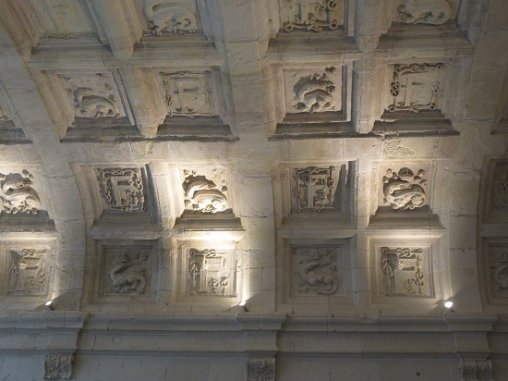 Aux plafonds les caissons contiennent les armoiries du Roi, alternant des "F" et des salamandres sculptées.