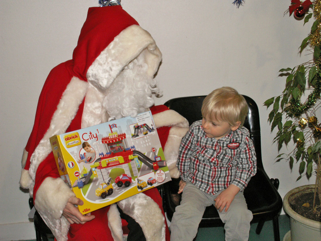 Enfin après avoir tiré la tombola des programmes et gâté quelques chanceux ou chanceuses, le Père Noël tant attendu a fait son entrée sur scène et s’est bien vite retrouvé encerclé par tous les bambins curieux de le voir de près et par les plus grands attirés par la corbeille de papillotes avec les pétards. Bien sûr la hotte du Père Noël était bien remplie et chacun a pu repartir avec jouet et sourire…