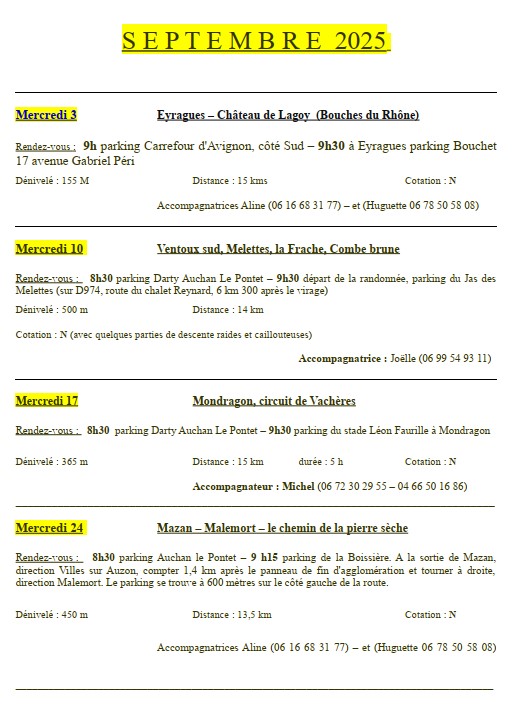 Le programme des randonnées pour le mois de septembre 2025