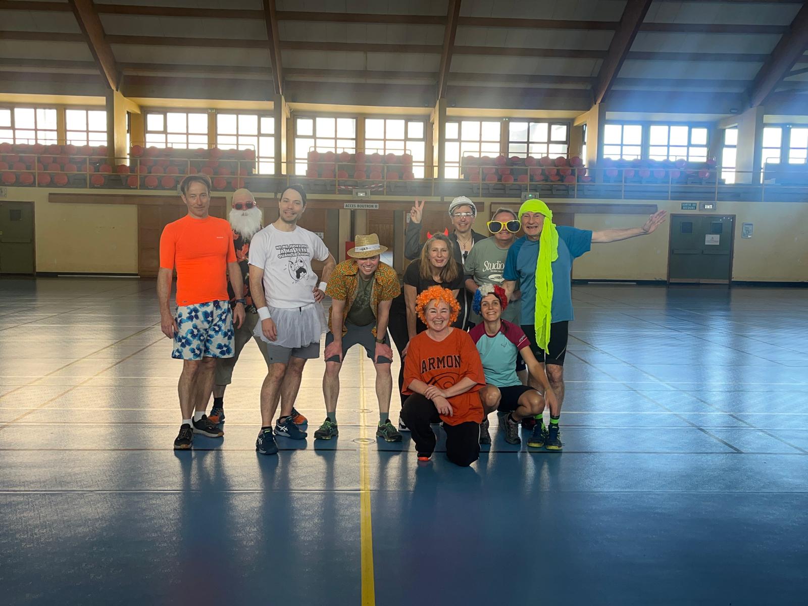 Le tournoi déguisé de badminton du lundi 10 mars 2025 s’est déroulé sous la surveillance d’un chef de chantier bien équipé (casque et lunette), et en présence de deux vacanciers estivaux égarés, d’un supporter de l’équipe de France, d’une bigleuse à grosse lunette et cheveux orange, d’une gracieuse ballerine du Bolchoï, de deux agents de la DDT (premier prix ex-aequo du meilleur déguisement), de Belzébuthe, et de tortue géniale en provenance de Namec.